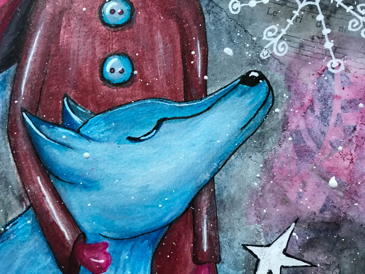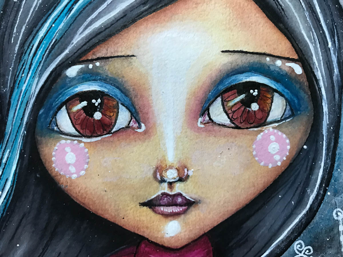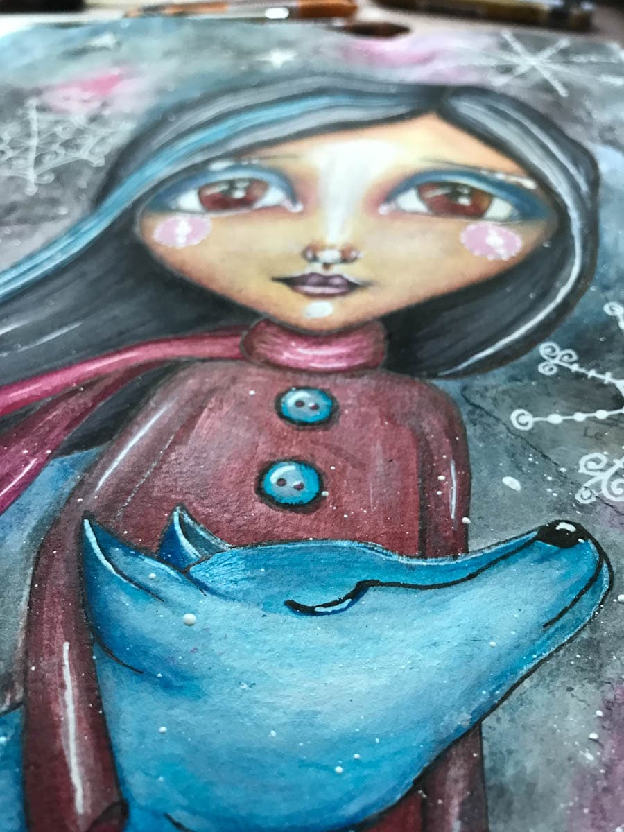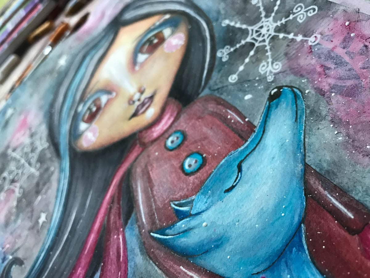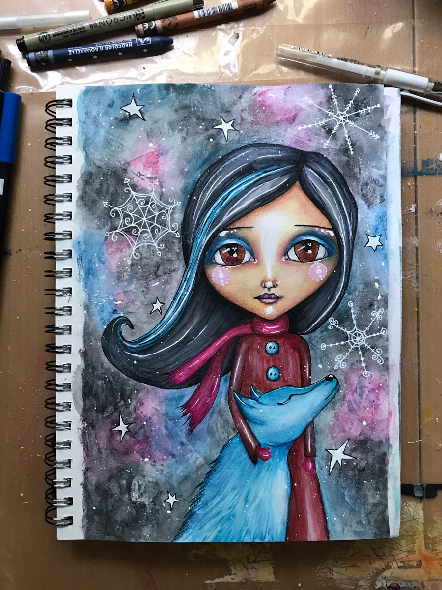 Good morning, All. Last weekend I shared with you that I am participating in another online class by the wonderful Tamara Laporte. One that Tam calls ‘Winter Soul Flakes’. The idea behind this particular class is to create a mixed media art pieces, all winter inspired and showing three girls and their furry friends. By the way, winter is o.k. as long as it is on paper. Now, that doesn’t sound too exciting all together, right? But the challenge is to create these three girls all with different shades of skin tones i.e. from very light to pretty dark. I started with the light skinned version, which I showed you last week, as seen here. Once finished I immediately started on the next one. Which, of course, was to be different, but similar, if that makes sense.