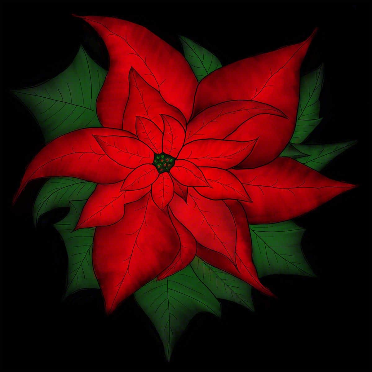 2. oh my gosh this is beautiful!!! Such detail you did. And yes, love how the black background just really makes it Pop! This is awesome because I cannot have a real poinsettia in the house due to the cat — so I have fakes ones in my greenery and lights — but they all seem “flat” Whereas yours just seems so alive!
