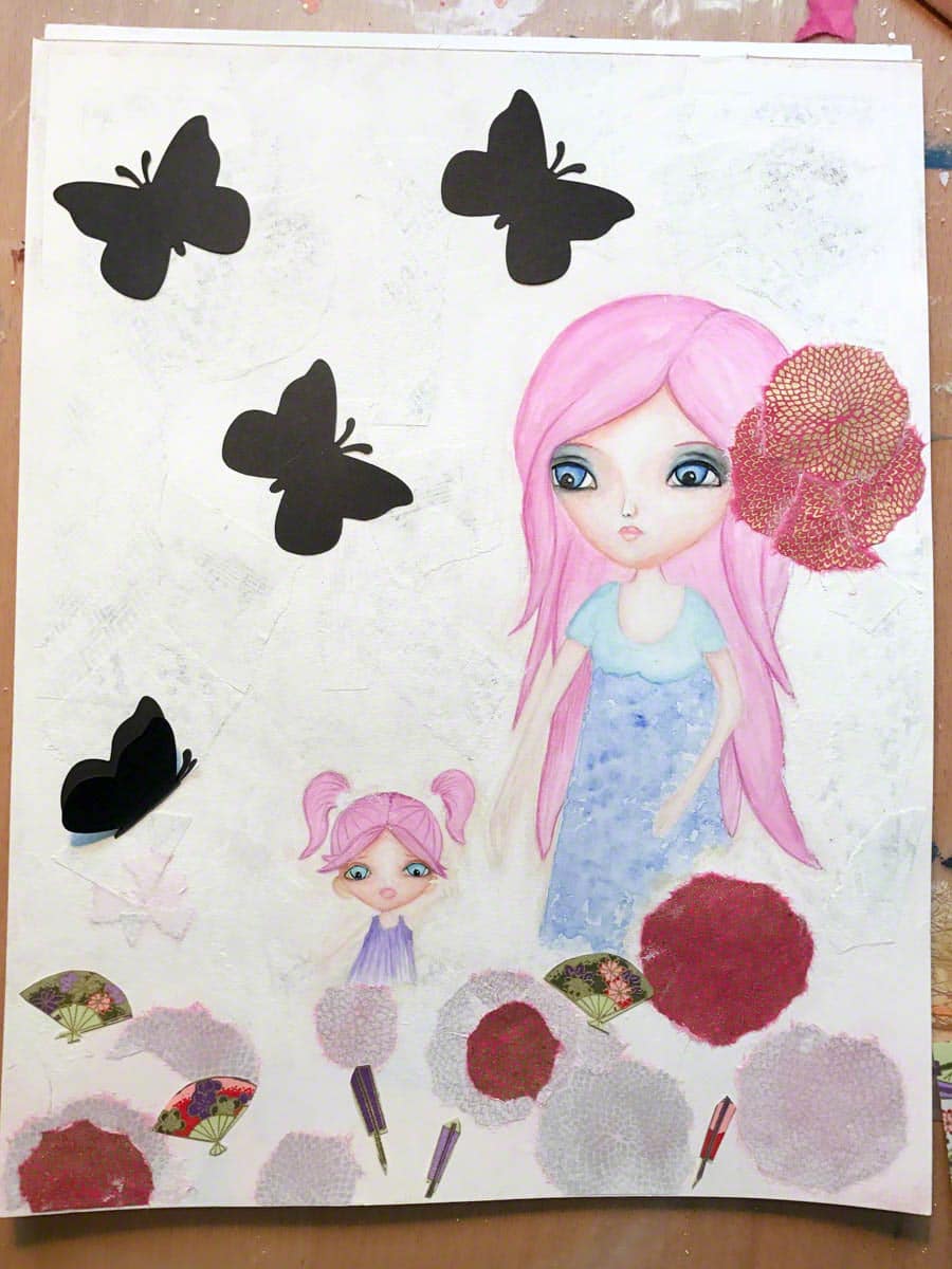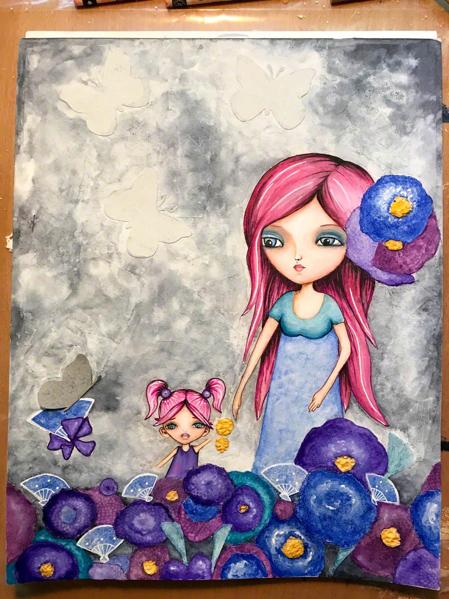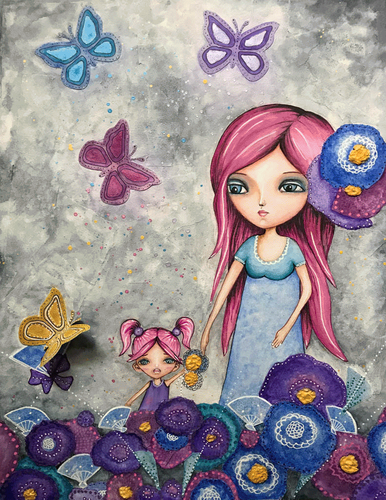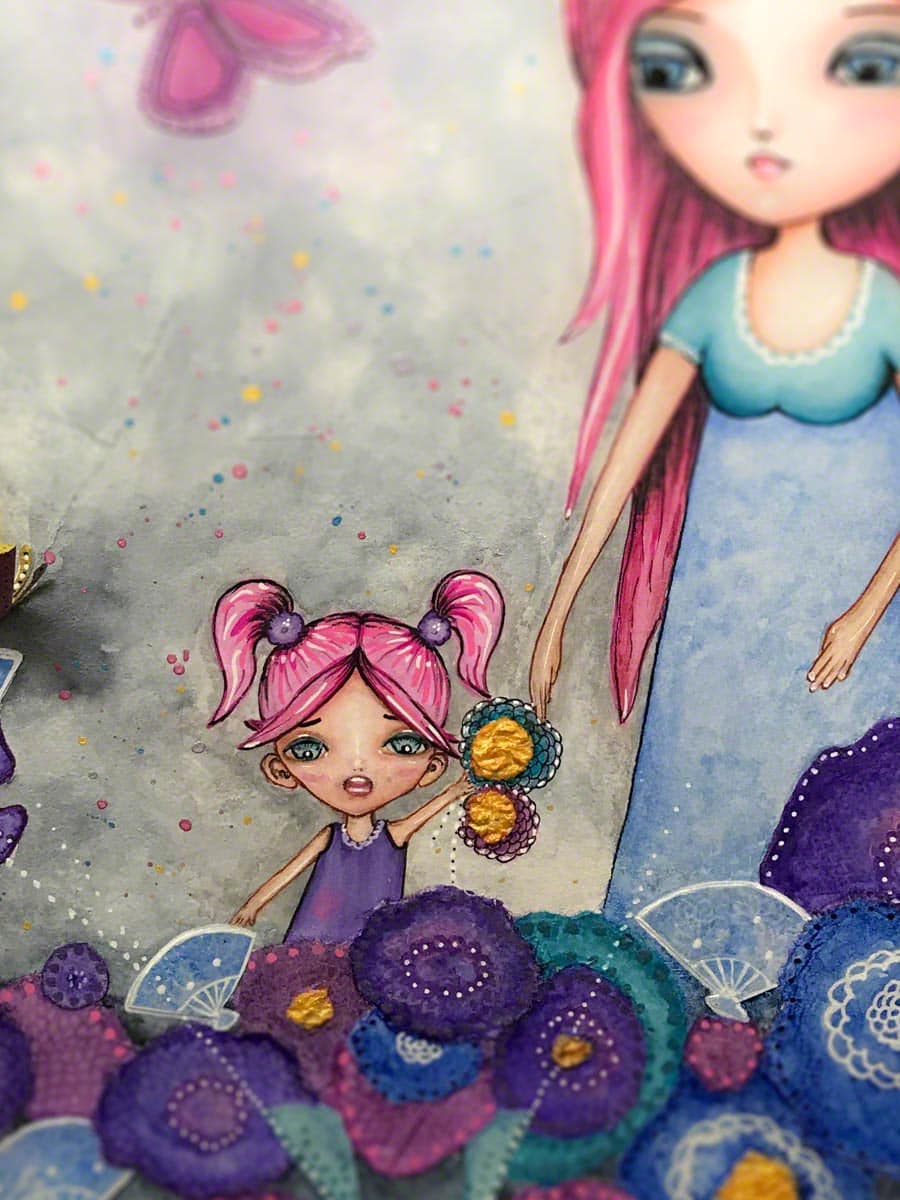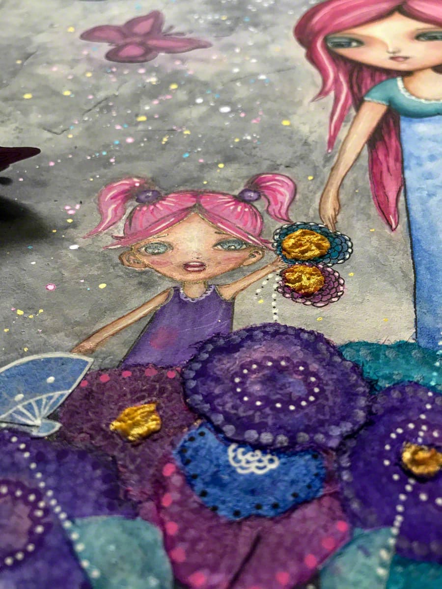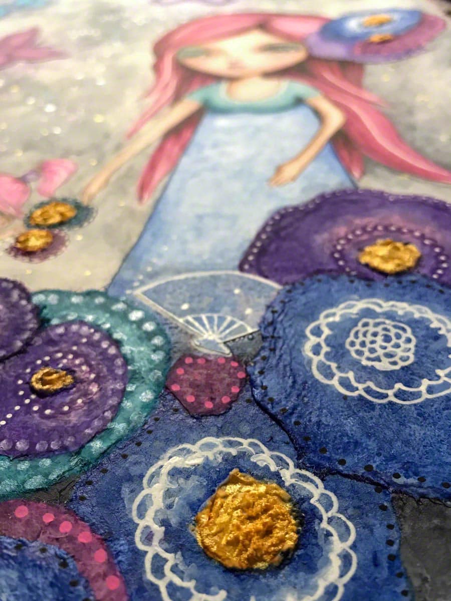 Honestly, there was and partly still is a bit of in-decision – pretty unusual for me in real life, I may add – in the detail work, the finishing touches. But I am making progress. As you may see, this piece is a bit more 3D, I used a molding paste for some of the flowers’ stencils. The same molding paste I used when gluing flowers on to each other, to make them stand out a little and giving a bit more of a depth effect. Which works to some extent, but not quite as much as I had intended. So now, I am trying to bring out more of it. Once done, I will do the work on the butterflies, the background and – of course – the little girl’s hands, too.