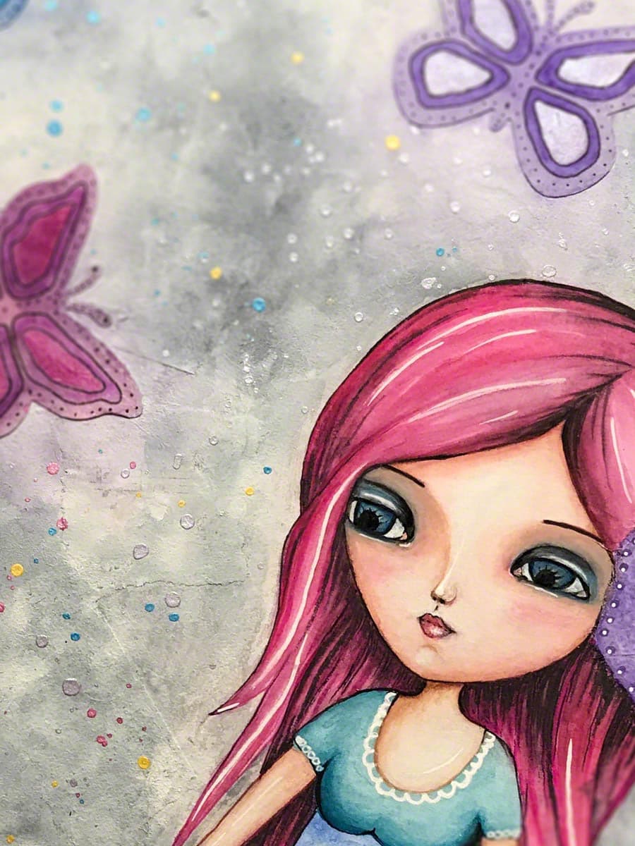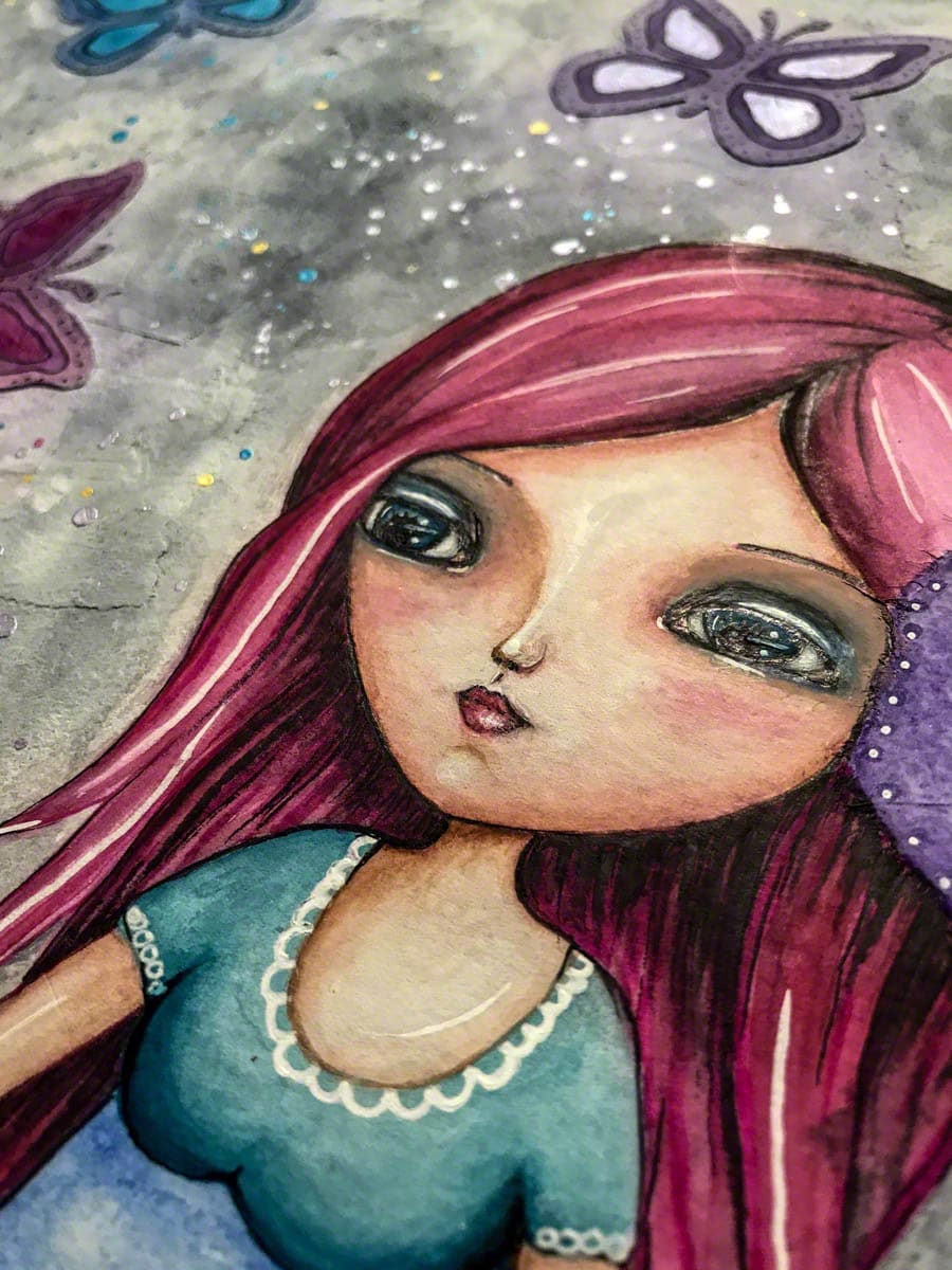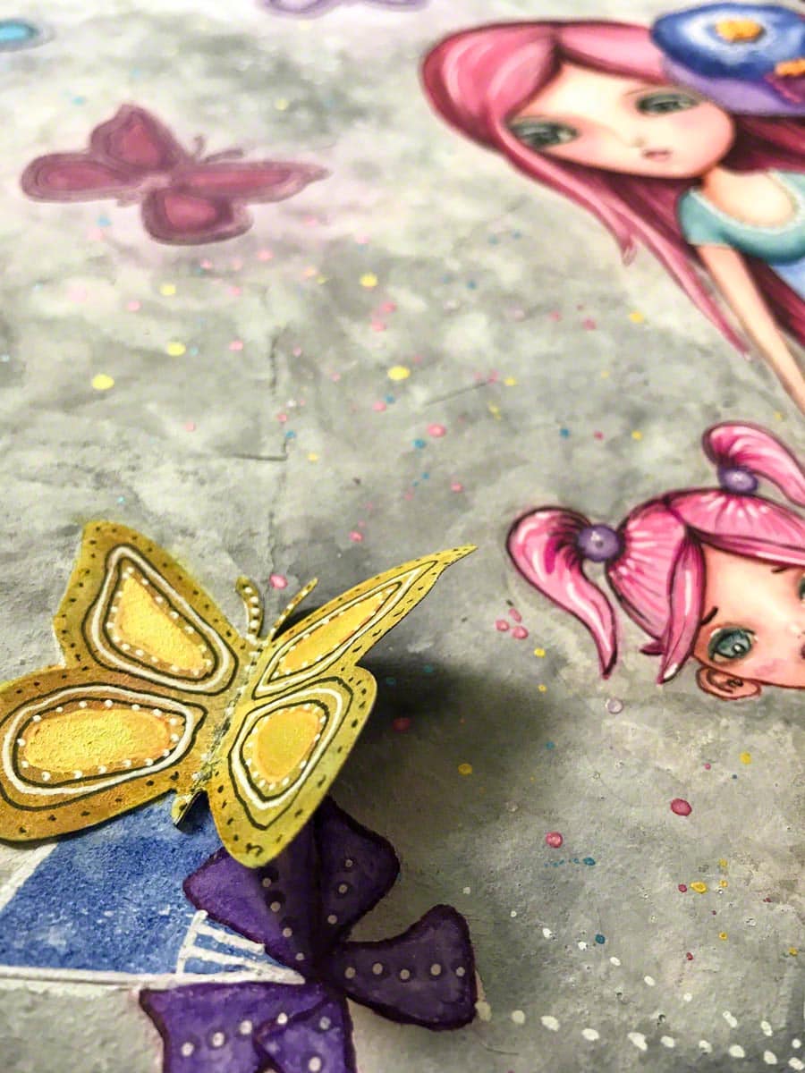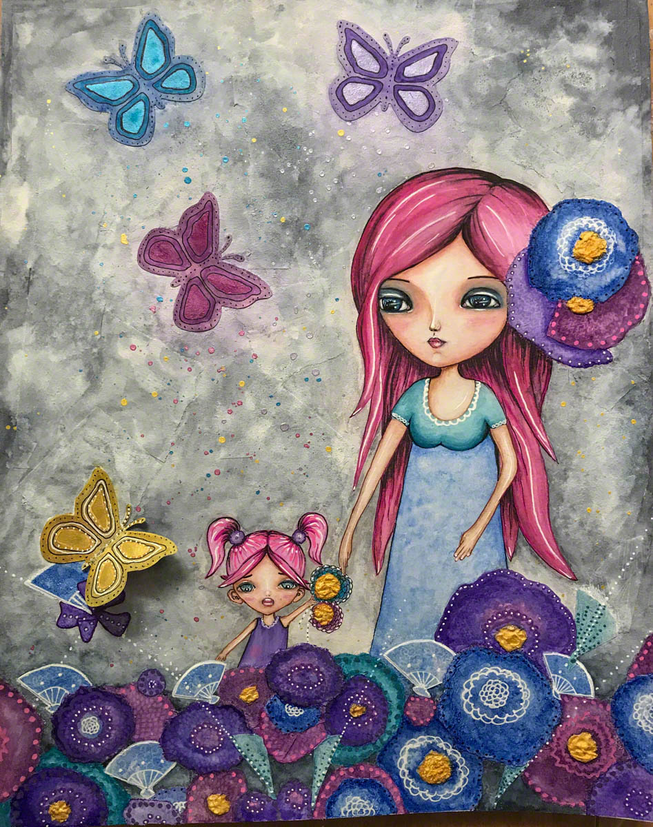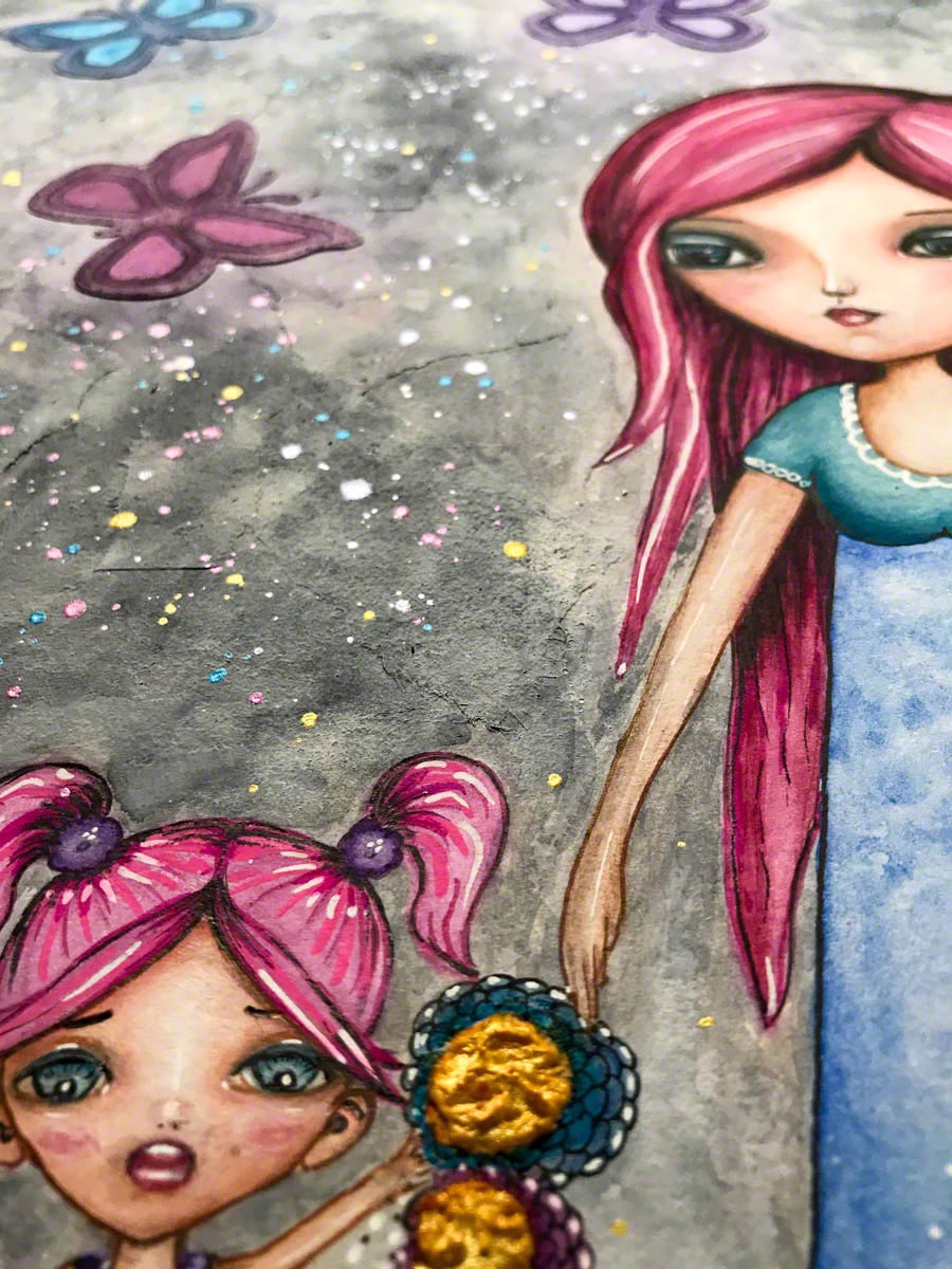 Honestly, there was and partly still is a bit of in-decision – pretty unusual for me in real life, I may add – in the detail work, the finishing touches. But I am making progress. As you may see, this piece is a bit more 3D, I used a molding paste for some of the flowers’ stencils. The same molding paste I used when gluing flowers on to each other, to make them stand out a little and giving a bit more of a depth effect. Which works to some extent, but not quite as much as I had intended. So now, I am trying to bring out more of it. Once done, I will do the work on the butterflies, the background and – of course – the little girl’s hands, too.